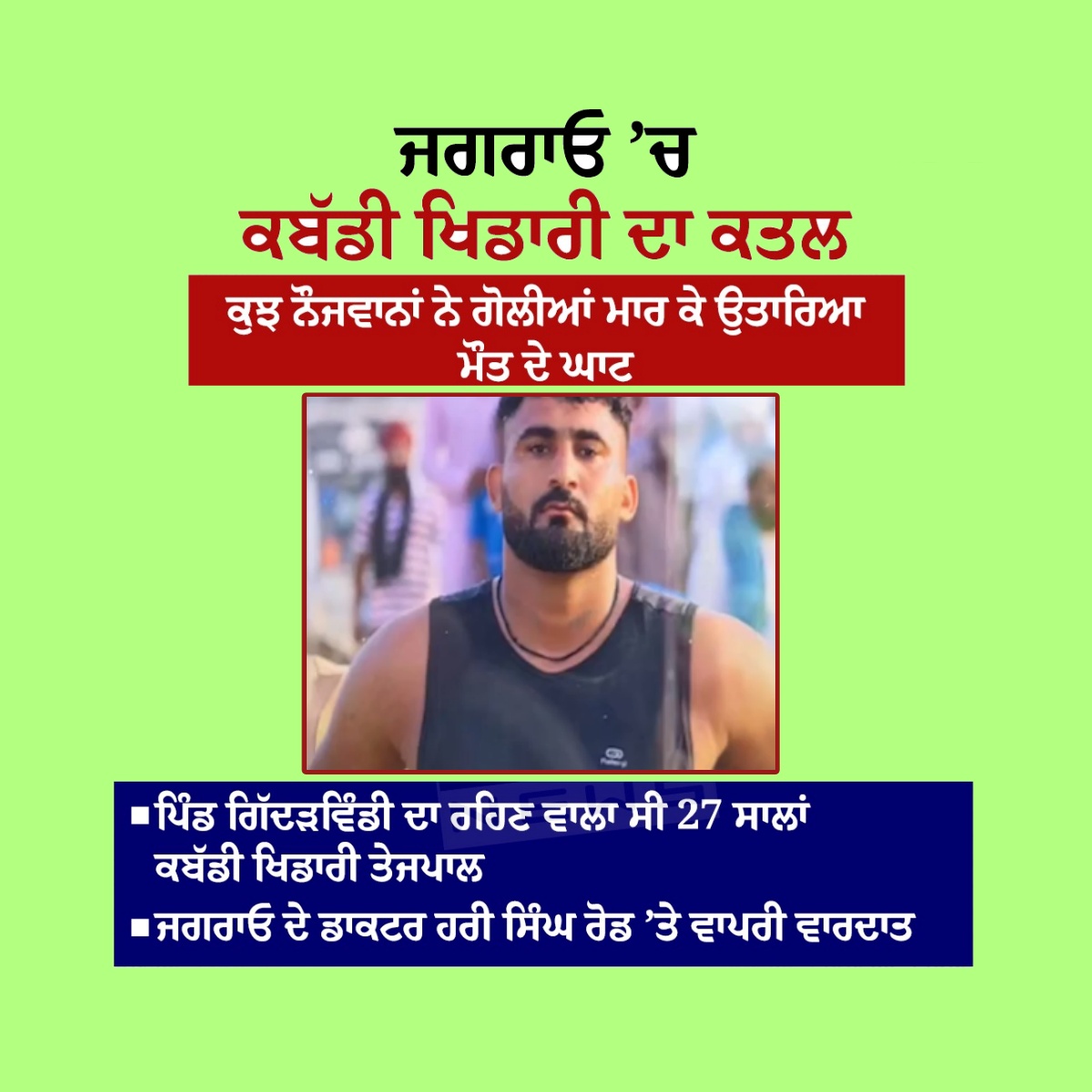 ਜਾਣਕਾਰੀ ਅਨੁਸਾਰ, ਕਬੱਡੀ ਖਿਡਾਰੀ ਨੂੰ ਜਗਰਾਉਂ ਦੇ ਡਾਕਟਰ ਹਰੀ ਸਿੰਘ ਰੋਡ ‘ਤੇ ਗੋਲੀਆਂ ਮਾਰੀਆਂ ਗਈਆਂ। ਗੋਲੀ ਚਲਾਉਣ ਵਾਲਿਆਂ ‘ਚ 8-10 ਨੌਜਵਾਨ ਦੱਸੇ ਜਾ ਰਹੇ ਹਨ। ਦੱਸਿਆ ਜਾ ਰਿਹਾ ਹੈ ਕਿ ਤੇਜਪਾਲ ਸਿੰਘ ਆਪਣੇ ਦੋ ਹੋਰ ਸਾਥੀਆਂ ਨਾਲ ਖਲ ਲੈਣ ਲਈ ਜਗਰਾਉਂ ਆਇਆ ਸੀ, ਜਿਥੇ ਉਸ ਦਾ ਪੁਰਾਣੀ ਰੰਜਿਸ਼ ਨੂੰ ਲੈ ਕੇ ਪਿੰਡ ਰੂੰਮੀ ਦੇ ਨੌਜਵਾਨਾਂ ਨਾਲ ਟਾਕਰਾ ਹੋ ਗਿਆ।