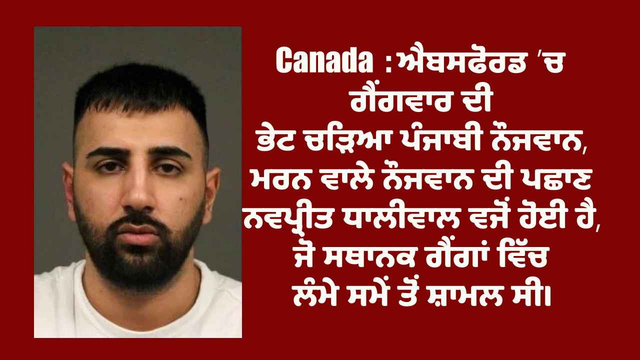 Canada – : ਐਬਸਫੋਰਡ ’ਚ ਗੈਂਗਵਾਰ ਦੀ ਭੇਟ ਚੜਿਆ ਪੰਜਾਬੀ ਨੌਜਵਾਨ, ਮਰਨ ਵਾਲੇ ਨੌਜਵਾਨ ਦੀ ਪਛਾਣ ਨਵਪ੍ਰੀਤ ਧਾਲੀਵਾਲ ਵਜੋਂ ਹੋਈ ਹੈ, ਜੋ ਸਥਾਨਕ ਗੈਂਗਾਂ ਵਿੱਚ ਲੰਮੇ ਸਮੇਂ ਤੋਂ ਸ਼ਾਮਲ ਸੀ।