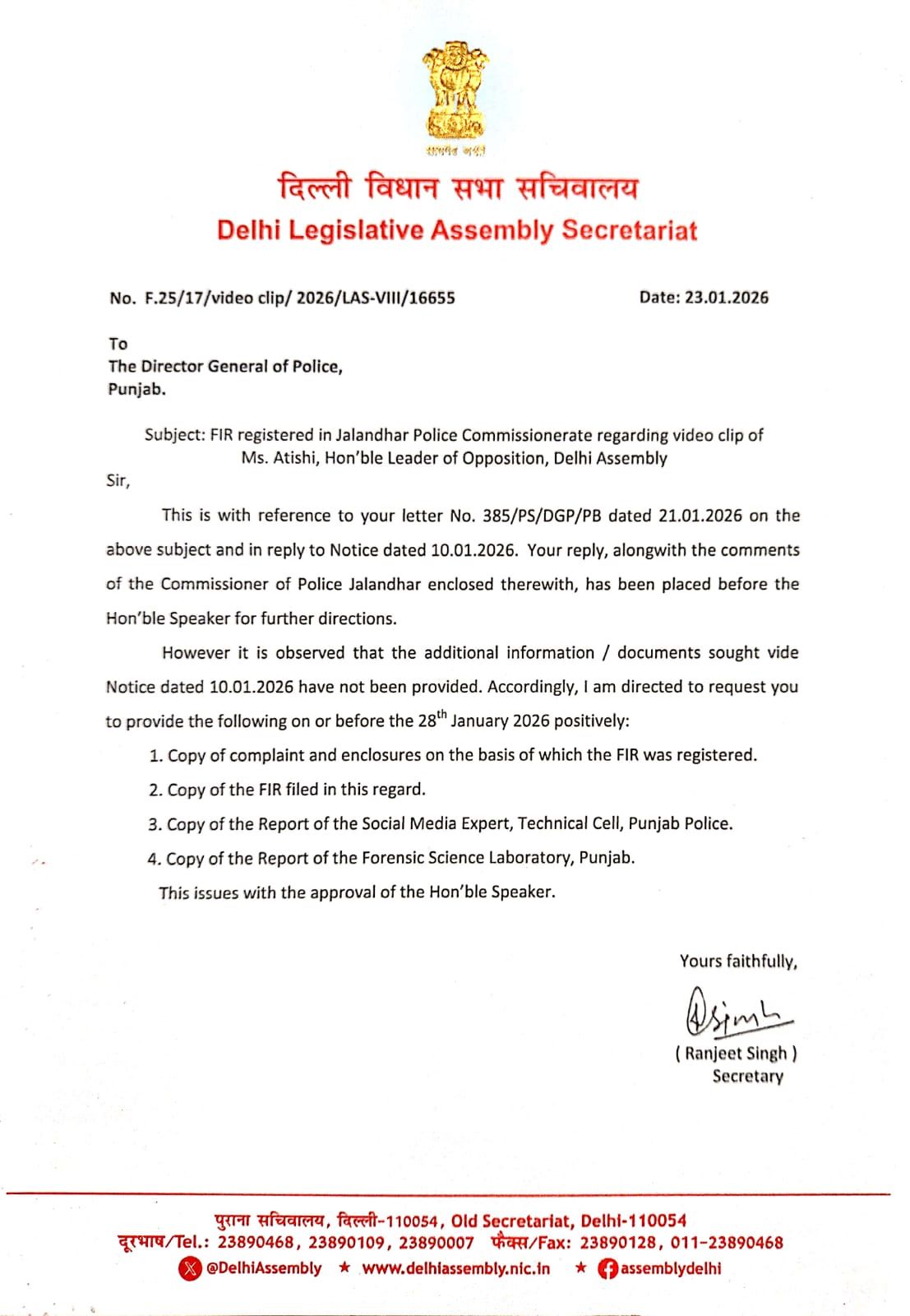Delhi Assembly Speaker Vijender Gupta has sought key documents from the Punjab Police DGP till January 28 in connection with the alleged video involving LoP Atishi. The Speaker has asked for copies of the complaint, FIR, social media expert’s report, and the FSL report.