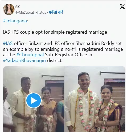 IAS-IPS Story, Viral Story: ਸੋਸ਼ਲ ਮੀਡੀਆ ‘ਤੇ ਕਈ ਵਾਰ, ਅਜਿਹੀਆਂ ਕਹਾਣੀਆਂ ਵਾਇਰਲ ਹੋ ਜਾਂਦੀਆਂ ਹਨ, ਜੋ ਦਿਲ ਨੂੰ ਛੂਹ ਲੈਂਦੀਆਂ ਹਨ। ਤੇਲੰਗਾਨਾ ਦੇ ਇੱਕ ਆਈਏਐਸ ਅਤੇ ਆਈਪੀਐਸ ਅਧਿਕਾਰੀ ਨੇ ਇੱਕ ਸਾਦਾ, ਬਿਨਾਂ ਕਿਸੇ ਦਿਖਾਵੇ ਦੇ ਸਾਦਗੀ ਭਰਿਆ ਰਜਿਸਟਰੇਸ਼ਨ ਵਿਆਹ ਕਰਵਾਇਆ।