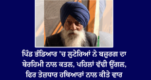 Read More »Amritsar : ਪਿੰਡ ਭੰਡਿਆਰ ‘ਚ ਲੁਟੇ*ਰਿਆਂ ਨੇ ਬਜ਼ੁਰਗ ਦਾ ਬੇ*ਰ*ਹਿ*ਮੀ ਨਾਲ ਕ*ਤ*ਲ