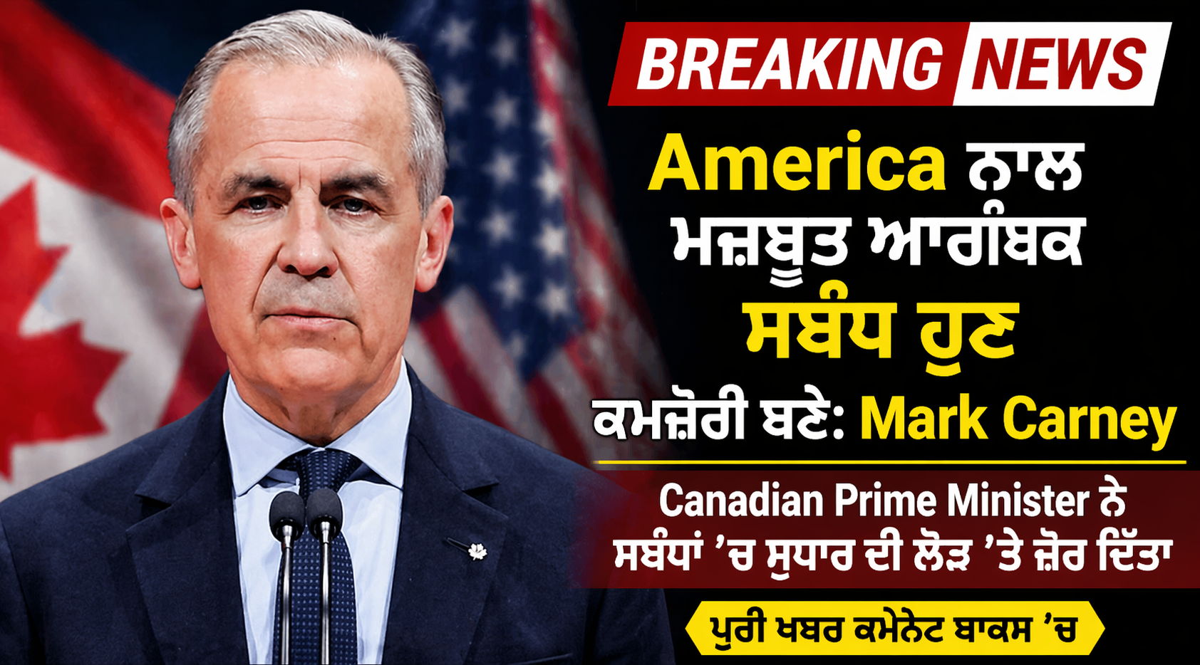 ਕੈਨੇਡਾ ਦੇ ਪ੍ਰਧਾਨ ਮੰਤਰੀ ਮਾਰਕ ਕਾਰਨੀ ਨੇ ਵੀਡੀਓ ਸੁਨੇਹੇ ’ਚ ਕਿਹਾ ਹੈ ਕਿ ਅਮਰੀਕਾ ਨਾਲ ਕੈਨੇਡਾ ਦੇ ਮਜ਼ਬੂਤ ਆਰਥਿਕ ਸਬੰਧ ਜੋ ਪਹਿਲਾਂ ਤਾਕਤ ਮੰਨੇ ਜਾਂਦੇ ਸਨ, ਹੁਣ ਕਮਜ਼ੋਰੀ ਬਣ ਗਏ ਹਨ ਅਤੇ ਇਨ੍ਹਾਂ ’ਚ ਸੁਧਾਰ ਦੀ ਲੋੜ ਹੈ।
